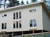 - Väggblock förberedda för isolering (165 mm) med vindpapp och 22 mm luftspalt, stående reglar 45×120 mm (klassat virke C24), liggande 45×45 mm, luftspalt 22 mm, sedan ytterpanel 22×145 mm samt boaseringsläkt 22×45 mm;